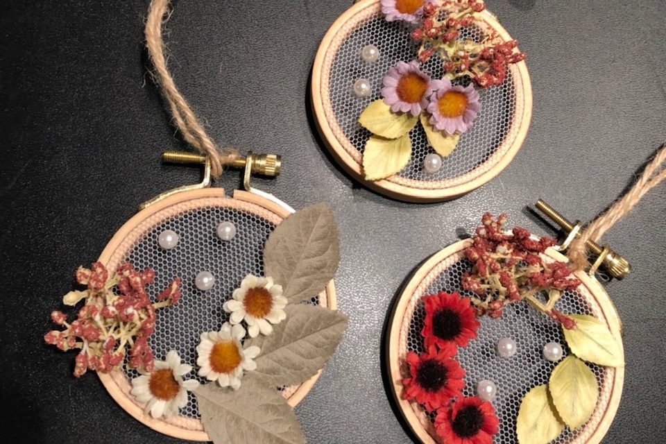 刺繍枠に好みのアーティフィシャルフラワーを飾りましょう。