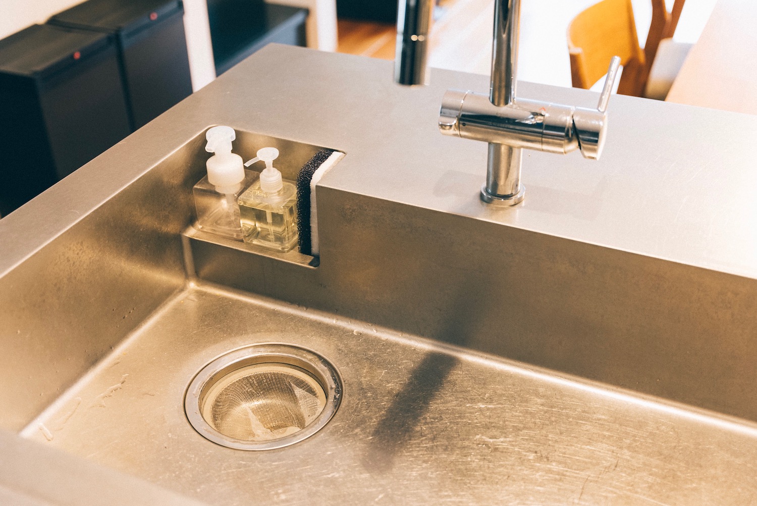 シンクも食器をドサッと入れられるサイズ感を特注でつくりました。お客さんがいるリビング側からは見えない位置に食器用洗剤の収納を設置するなど、細かなこだわりをどんどん採用したら、建築費全体の10%以上をキッチンが占めることになってしまいました。