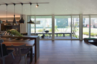 外とのつながりをもつ、アウトドアダイニング、壁一面の大開口より光が入り、開放感をもたらします