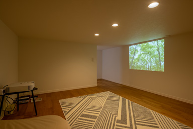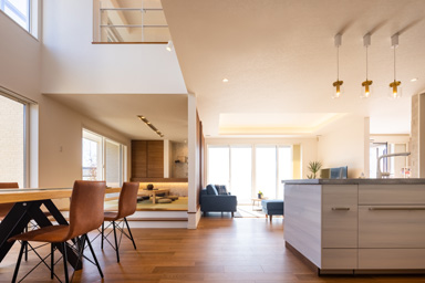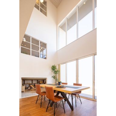 ハーフ収納上の書斎、その上の子供室までつながるダイニングの吹抜け
