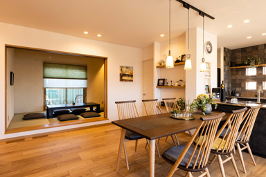 キッチンを中心に、ダイニング、インナーテラス、小上がりの和室がつながります。