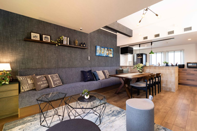 親世帯の1階リビングは、石目調タイルの壁や木パネルの天井など素材の質感が心地よい寛ぎの空間です。