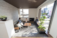 落ち着きのあるダウンフロアリビング。床面を下げることでくつろぎ感と天井高を確保しています。