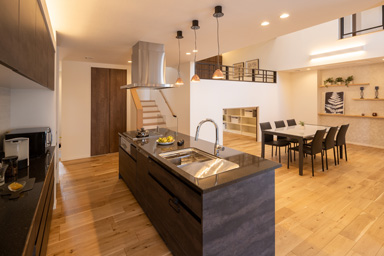 インパクトのあるアイランドキッチンをLDKの中心にもっていきデザイン性の高いLDKが実現できました。