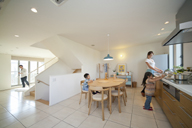 自然素材を使った、収納たっぷりリビング。広いベランダ・オープンキッチン・勉強コーナー等。