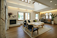 • 家の中心は、横にも縦にも広がった開放感のある明るいリビング。大理石張りの暖炉が引き立ちます。