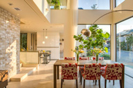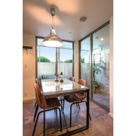 • 大開口の吹抜けから明るい光が差し込むダイニング。内から外へ繋がるキャンティの床は広さを強調