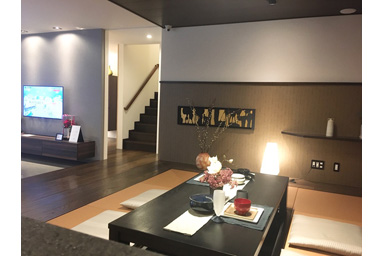 なぐり調フロアとタイル仕上げの土間リビングを融合した和モダンなインテリア。