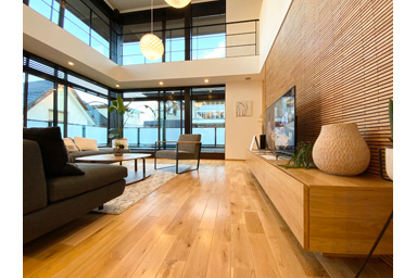 国産ナラ材を用いたナチュラルなインテリアと、家事分担・家族のコミュニケーションを生みだす広々空間。