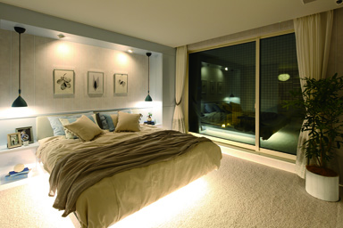 ホテルライクな寝室が一日の疲れを癒してくれます。隣接のドレッシングルームも見どころです。