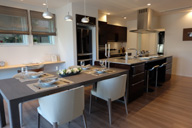 豊富な収納スペースを備え、美しさと使いやすさを兼ね備えた1階のダイニングキッチン