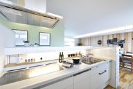 • 子世帯の暮らす2階にはアカシアの床と、明るい木の素材やタイルを活かしカジュアルな空間に仕上げています