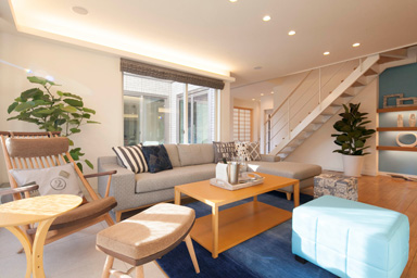大開口から光が注ぎ、やわらかく包まれた親子三世代のくつろぎ空間。窓辺には愛犬のドッグランスペースも。