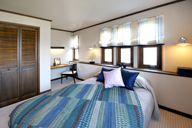 • 落ち着いたダークブラウンに色鮮やかなファブリックを合わせた主寝室。 窓辺からは柔らかい光が差し込みます。